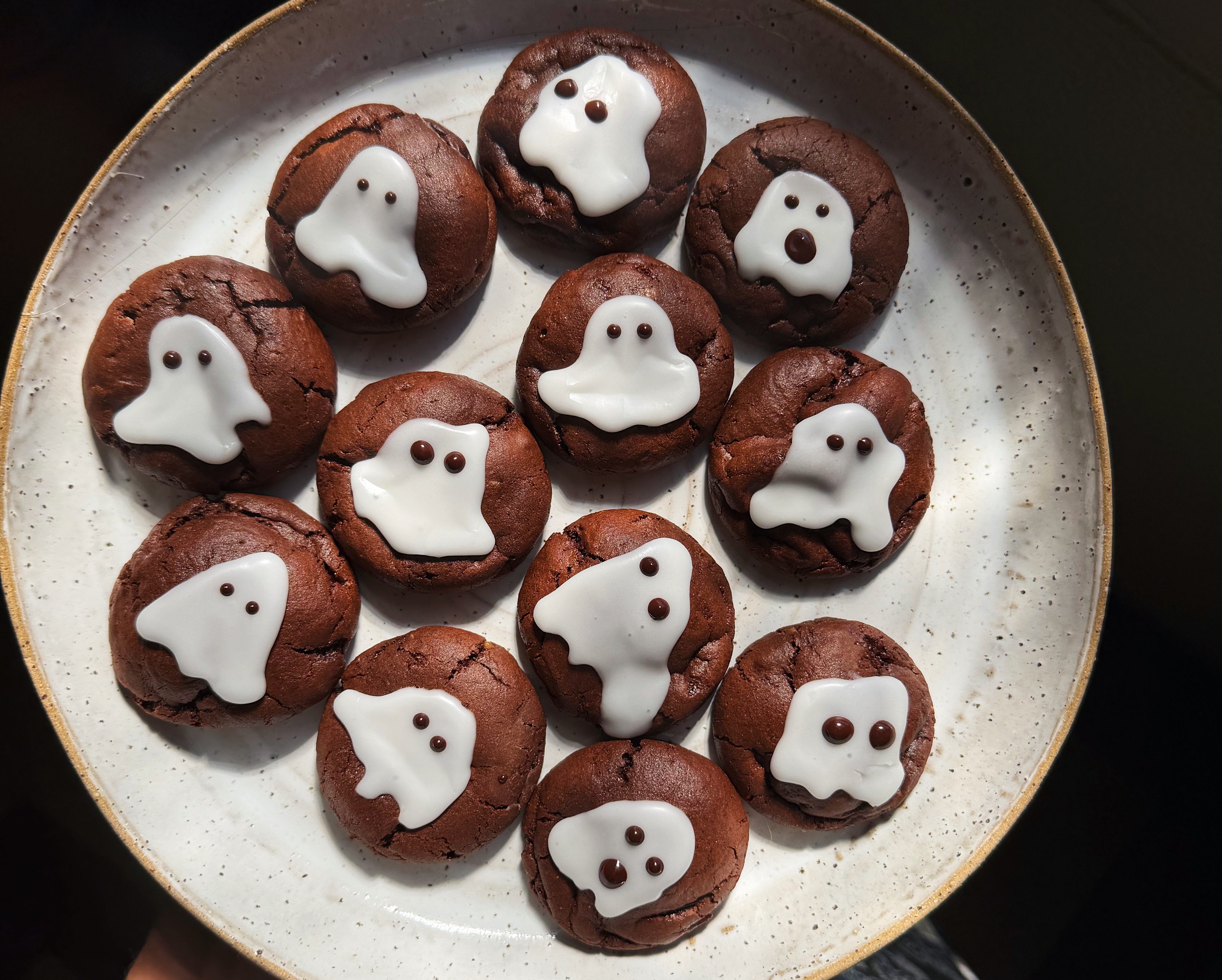 Halloween is upon us, and I’ve spent most of the day decorating salted chocolate cookies with icing sugar ghosts. Yay! Or should I say… Boo!